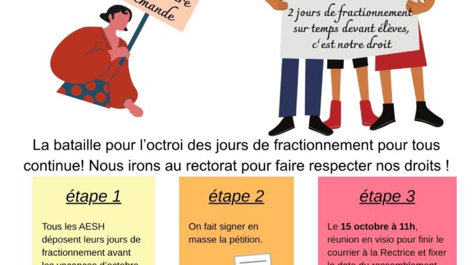 Le combat lancé au printemps 2025 porte ses fruits puisque certains AESH sont désormais autorisés à poser leurs jours de fractionnement. Ce que nous voulons c’est que ce droits s’applique à TOUS!